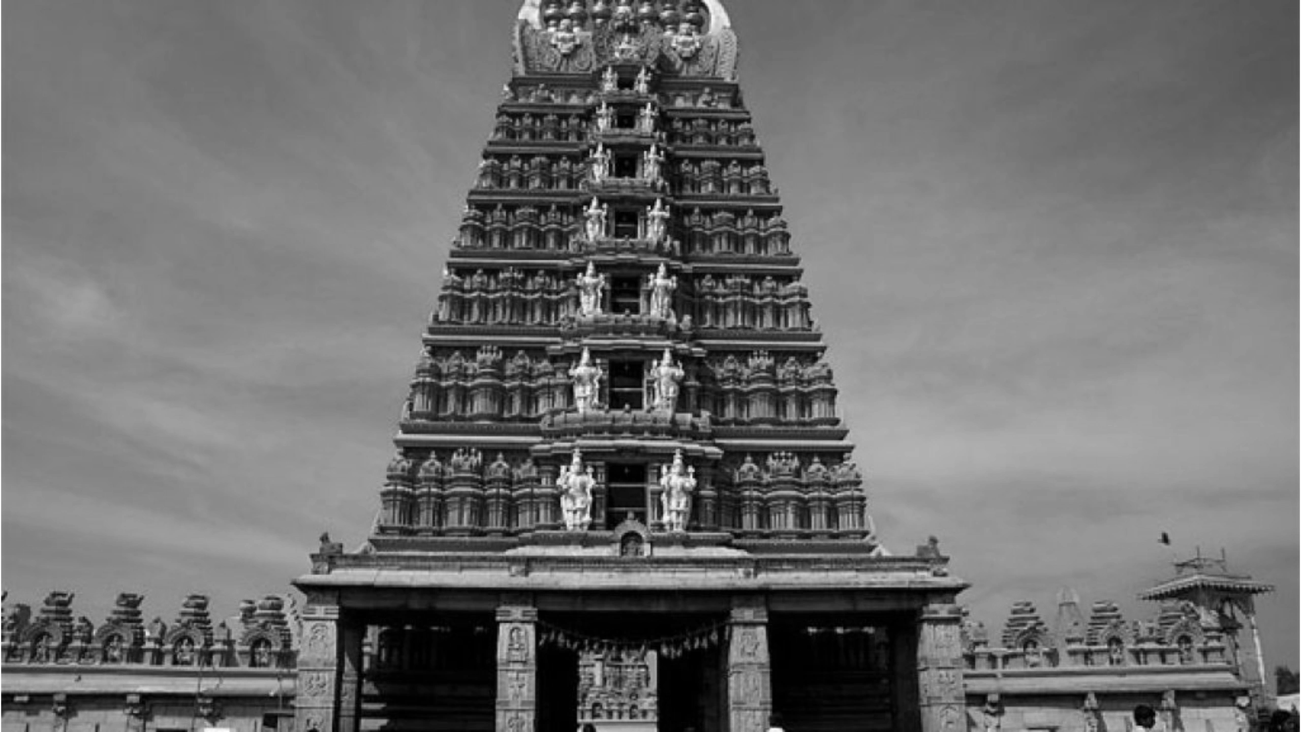 The nine-storied tall Gopura or tower is ascribed to the queen of the Mysore kings, Devarajammanni, wife of Krishnaraja Wodeyar III (1849). The 120ft tower boasts of stucco images, decorations, 7 gold kalashas, each 3 meters tall exhibiting the Dravidian architecture.